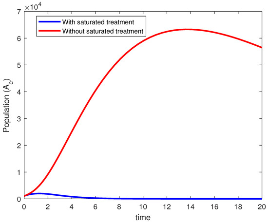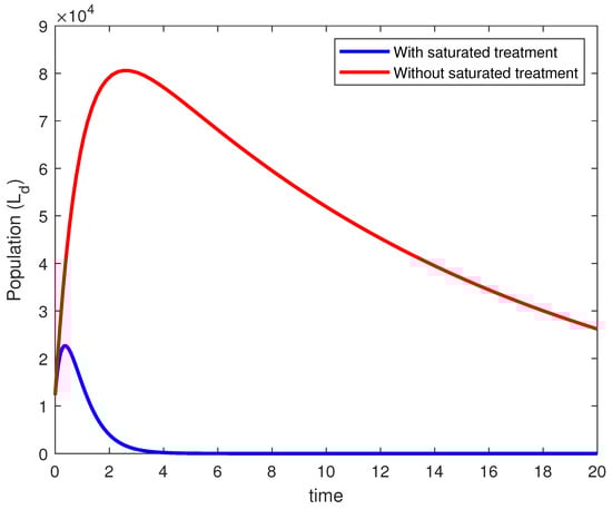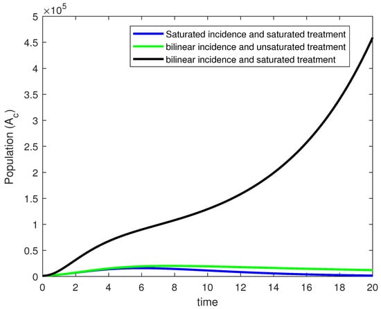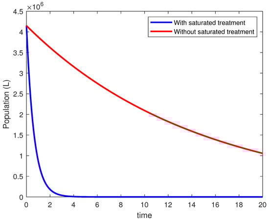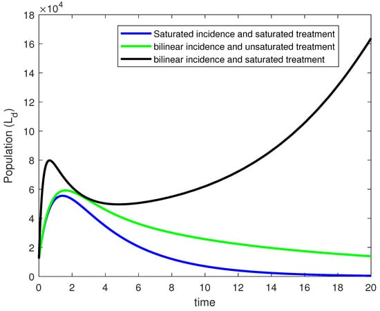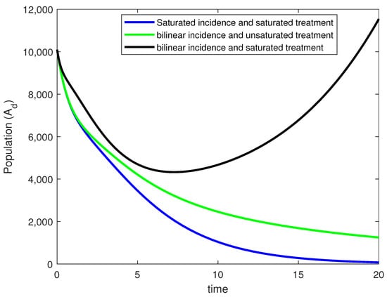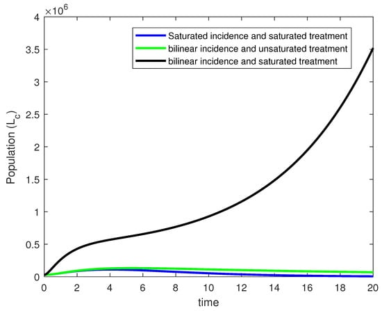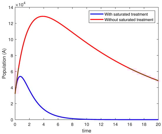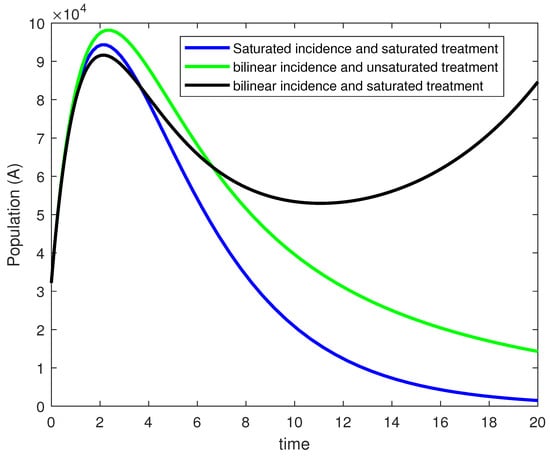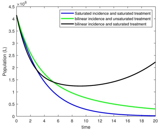 In a case when , we have the unsaturated treatment regimen of latent tuberculosis infections (LTBIs), i.e., the treatment is now assumed to be proportional to the number of individuals exposed to tuberculosis infections. Also, by setting , we have the bilinear incidence rate and the per capita treatment rate of latent tuberculosis infections is decreased by about 87% to perform the simulations in Figure 10, Figure 11, Figure 12, Figure 13, Figure 14 and Figure 15, i.e., . We compare model (1) with saturated incidence rate and treatment of LTBIs with the unsaturated treatment intervention of LTBIs and bilinear incidence rate. We observe that tuberculosis infections in both latent and active forms can be eliminated from the population very fast when individuals exposed to TB are treated with the saturated treatment regimen and saturated incidence rate utilized. Both active TB infections and latent TB infections stay around for a long with the bilinear incidence rate and unsaturated treatment regimen but eventually die out in the long run. Due to the concerning rise in the incidence of diabetes over the past decades [12], we quadruple the parameter values and in the simulation for the bilinear incidence rate and saturated treatment with the intention of investigating the influence of the increased incidence of diabetes on the spread of TB infections. The numerical simulations in Figure 10, Figure 11, Figure 12, Figure 13, Figure 14 and Figure 15 confirmed the persistence of tuberculosis disease in the population with the increased incidence of diabetes.