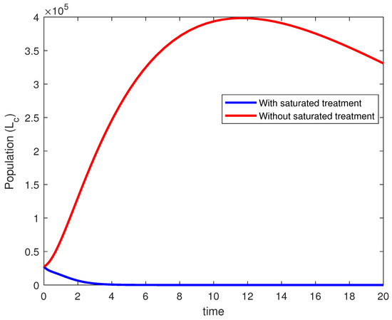 In Figure 4, Figure 5, Figure 6, Figure 7, Figure 8 and Figure 9, the simulation results show that the absence of the saturated treatment of LTBIs (setting ) will lead to the persistence of the tuberculosis disease in all the compartments with actively and latently infected individuals. The basic reproduction number is when and this established our theoretical finding about the endemicity of the disease when . With the saturated treatment of LTBIs, the basic reproduction number is . It is observed that tuberculosis disease dies out eventually in both the diabetic and non-diabetic populations within 20 years.