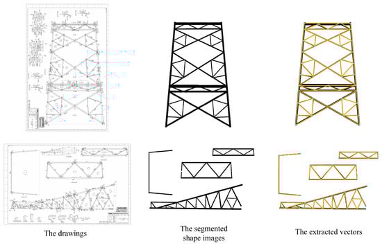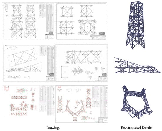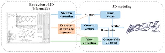 The task of automatically reconstructing 3D models from 2D design drawings has a long history; however, it has primarily been applied to simple industrial components and is predominantly based on three-view drawings [3]. For instance, some methods reconstruct 3D objects by identifying fundamental shape elements from projected views and calculating their spatial relationships and inclusion hierarchies through element knowledge retrieval and graph theory [4,5]. Nevertheless, these approaches are limited to handling simple objects with uniform thickness and cannot be applied to more complex structures, such as transmission towers. Another approach, based on wireframe models [6,7], involves extracting vertices and contour lines from 2D drawings. This method begins by establishing an initial candidate wireframe based on the extracted contours, followed by refining the contour lines through iterative processes to obtain the final 3D wireframe vector set and their corresponding modeling relationships. However, this method is hindered by low computational efficiency and often yields unstable or erroneous results, particularly when applied to complex geometries [8].