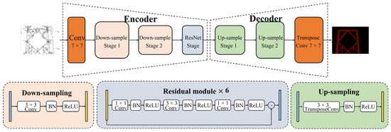 A design drawing of a transmission tower typically includes various elements such as geometric shapes, symbols, text, and tables. The recognition of text, tables, and annotation circle symbols has been extensively studied in previous research; therefore, we will not reiterate those methods here. Extracting shape information is essential in3D modeling, and can be achieved using a shape segmentation network, as in Figure 2, to eliminate redundant information. The network employs an encoder–decoder architecture. For a given design drawing of a transmission tower, the encoder first encodes the feature vectors of the input image, while the decoder retrieves the binary mask of the geometric shapes. The encoder consists of seven convolutional blocks, each comprising a convolutional layer, an instance normalization layer, and a LeakyReLU activation layer. The decoder contains seven deconvolutional blocks and an output block, where the output block consists of one deconvolutional block and a sigmoid activation layer. The network uses binary cross-entropy to calculate the loss: