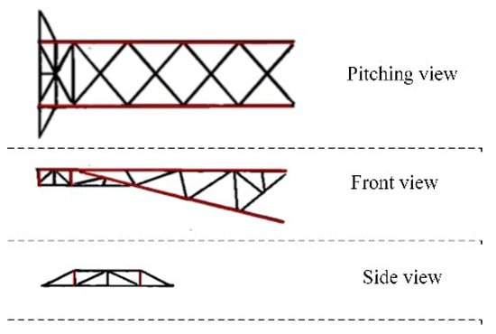 The outer contour vectors represent the boundary intersections of shape planes from various perspectives. Therefore, the position of these contour vectors within a unified 3D coordinate system can be determined by knowing the viewing angles of each plane. The design guidelines for transmission tower drawings are still based on projection techniques, allowing the spatial orientation of the contour vectors to be distinguished by three classified projection views: front view, side view, and pitching view. Typically, transmission tower drawings are designed with the front view as the primary perspective, while the side view and pitching view serve as supplementary perspectives. An example of the different views of the drawings is illustrated in Figure 4.