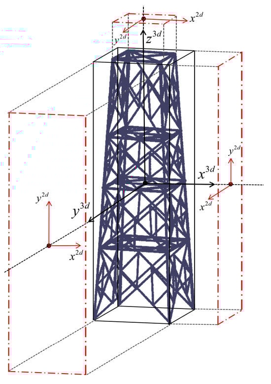 However, we can still derive from Equation (4) using the combinations of “front view + pitching view” or “front view + side view”. Therefore, our method is effective as long as the tower section in the 2D projection of the front view is completely symmetrical. In fact, this condition is generally satisfied in practice.