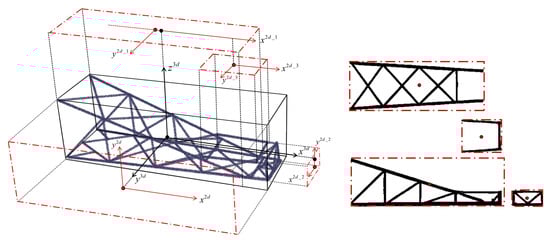 It is important to note that Equation (3) is applicable only to sections that exhibit complete structural symmetry. Consequently, the coordinate origin of the 2D plane and are coaxial. However, when the model exhibits asymmetry from certain perspectives, the coordinate origin of the right projection image is no longer coaxial with . As shown in Figure 6, the section is asymmetric in the side view. In this case, only can be determined. Similarly, the projection origin of the pitching view is not coaxial with , and only can be determined. Therefore, Equation (4) must be modified as: