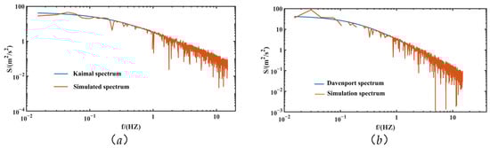 The power spectrum of simulated fluctuating wind. (a) Kaimal power spectrum; (b) Davenport power spectrum.