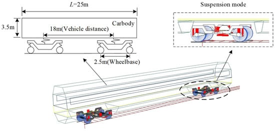 With reference to relevant parameters of CRH2 high-speed trains, we build a train model with 38 degrees of freedom (DOF) in SIMPACK 2018 software, as shown in Figure 5. The model consists of multiple rigid bodies including train body, bogie frame, and wheelset [41], in which the vertical DOF of the wheelset is not considered. The suspension characteristics and connection relationship between rigid bodies are determined by the force element, hinge, and constraint.