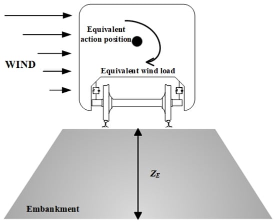 First, we determine the application position of the equivalent wind load, which is the equivalent action position of the wind load. To make the simulation results more closely resemble the on-site environment, this paper takes into account the characteristic that wind speed changes with the height of the embankment when calculating the equivalent application position of wind load, and the relationship between average wind speed and embankment height is shown in (9). Then, the equivalent average wind speed of the train is calculated according to the proposed method. Finally, the equivalent wind load is calculated using the equivalent average wind speed.