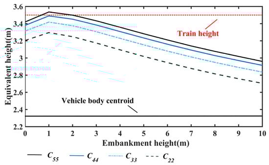 where is the embankment height, is the distance between the centroid of the train body and embankment, is the relative wind speed at height , , the height of train body is set to 3.5 m, is the equivalent applied height of wind load on the train body, and . is the lateral aerodynamic coefficient at height , represents the shaking angle of wind direction at height . is the lateral aerodynamic coefficient at height , and [39,40]. is the train length. Furthermore, the equivalent wind load is calculated according to (6). In the four experimental instances, , , , and , the calculation results of under different embankment heights are shown in Figure 7.