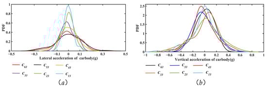 Probability density function (PDF) of responses of train body. (a) Lateral acceleration of carbody; (b) Vertical acceleration of carbody.