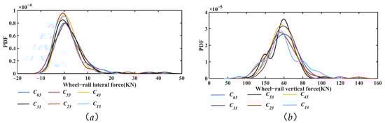 PDF of responses of model. (a) Wheel–rail lateral force; (b) Wheel–rail vertical force.