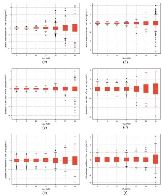 It can be found from Figure 10 that when the train speed remains the same, the discreteness of the train’s lateral acceleration response became large with the increase in standard wind speed, and the number of transfinite individuals in the sample is also increasing. In addition, with the increase in train speed, the lateral acceleration of the train also tends to increase under the same wind speed.