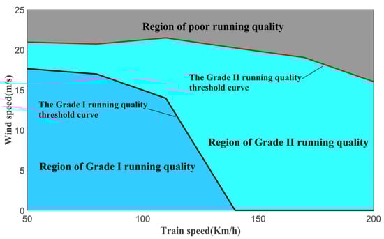 Considering the random response of the train body and the economical efficiency of train services, the allowable error of the train’s overrun probability P is set to 4.55% [46]. According to the obtained linear regression function and allowable error, we obtain the two-level running quality threshold curve of trains under different running conditions. Under the premise of ensuring the safety of train operation, Grade-I running quality requires higher train dynamics response results. The train runs more smoothly under this requirement, which can be used as the speed threshold curve for passenger trains. In contrast to Grade-I running quality, Grade-II running quality allows the train to run faster. The train’s transportation efficiency is higher under this requirement, and it can be used as the speed threshold curve for freight trains.