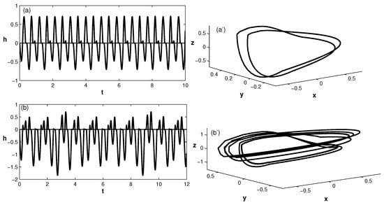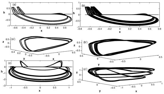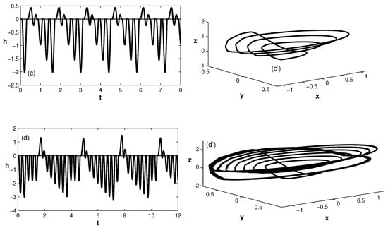 To present available and interesting results gained using the proposed system, we use numerical analysis to examine the effects of various appropriate parameters on flow behavior. Consider as the control parameter, while the other parameters in the system in (14) remain constant as follows: , and . Figure 3a,a’ show that when is set to , the discontinuous system in (14) forms a unique periodic orbit that interacts with the sliding mode. When is set to 1, a period-doubling orbit exhibiting sliding-mode behavior is observed (Figure 3b,b’). Further, the presence of period-m segments and chaotic behavior are established (Figure 3c,c’,d,d’) when and , respectively. The periodic-sliding attractors in Figure 4 undergo a period-doubling transition to chaos when the parameter changes, but the rest of the parameters remain constant: , and .