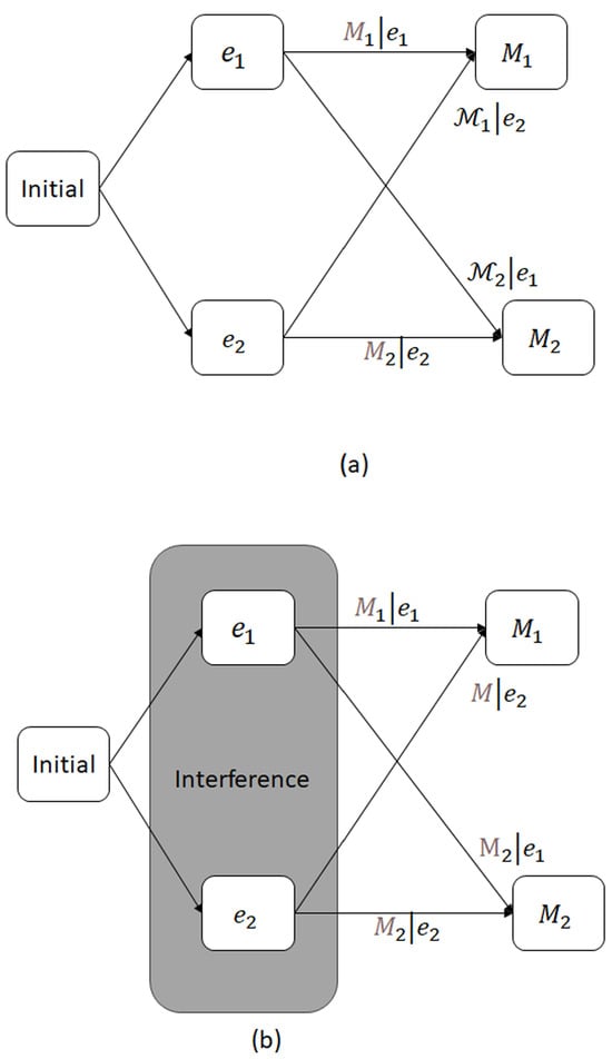 Within the QPT framework (Figure 2b), the state is formed by combining three fundamental states, which can be represented as different wave functions aligning according to Feynman’s second rule. The amplitude of the final form is obtained by superimposing two individual routes running from ‘Initial’ to . The amplitude is the sum of the individual pathways from source ‘Initial’ to target , and the probability of reaching the target is equal to the square of the amplitude, presented in Equation (7).