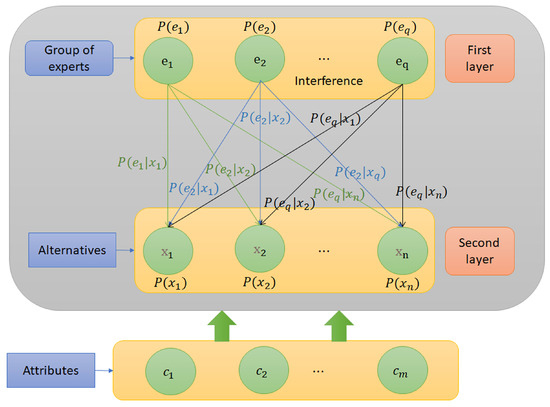 In this phase, we converted the pre-collected data into probabilities and developed a Bayesian network (BN) for decision making, as the quantum framework is a partial extension of the BN. Figure 3 illustrates that in an MCGDM situation, the decision-making process can be represented as a simple two-layer BN. The first layer probabilities are determined in the following way.