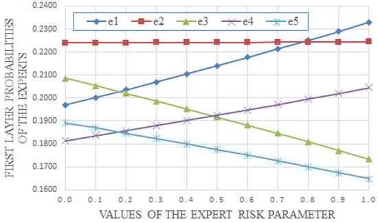 Let be the relative weight of the criteria of expert . Then, based on Equation (15), we obtain
