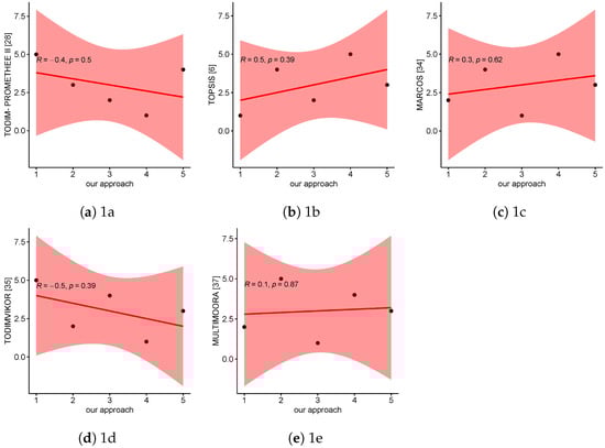 Furthermore, here, we use the Spearman rank correlation (SRC) test to compare and contrast our approach with the other five techniques. We used SPSS 21.0 to run the SRC in order to compare the ranking performance of these five approaches. The results of this investigation are displayed in Figure 9. R stands for the correlation values and p for the p-value in Figure 9. When R is close to 1, it indicates that the two techniques’ ranking results are more comparable, and when p is less than , it indicates that there is a substantial correlation between them.