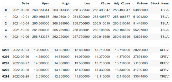 The stock price dataset was collected by Yukhymenko [11]. This dataset has been extensively used in the literature [9,56] to model stock prices. The dataset contains the daily information of 25 companies from 30 September 2021 to 29 September 2022. The dataset includes 6300 observations over eight features (namely, date, open, high, low, close, adjusted close, volume, and stock name). The data were collected only on weekdays (Monday to Friday), and no missing values were found. The companies represented in the dataset were Tesla (TSLA), Microsoft (MSFT), Amazon (AMZN), Google (GOOG), Apple (AAPL), Netflix (NFLX), Taiwan Semiconductor Manufacturing Company Limited (TSM), Coca Cola (KO), Ford (F), Procter & Gamble Company (PG), Costco (COST), Disney (DIS), Verizon (VZ), Salesforce (CRM), Intel (INTC), Boeing (BA), Blackstone (BX), Northrop Grumman Corporation (NOC), PayPal (PYPL), Enphase Energy (ENPH), NIO In (NIO), ZS, and XPeng Inc (ZPEV). Each company contributed approximately 252 records. Figure 1 presents a view of the dataset.