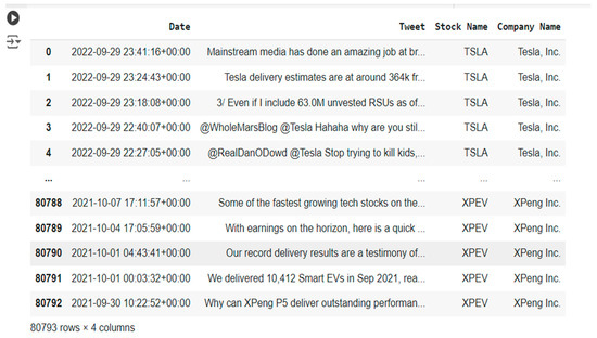 The text data used in this study were tweets collected from Twitter (currently known as X) by Yukhymenko [11], which contained four attributes (namely, date, tweet, stock name, and company name, as shown in Figure 2). The dataset contained 80,792 observations and, for the purpose of this study, only tweets with more than 10 likes were selected.