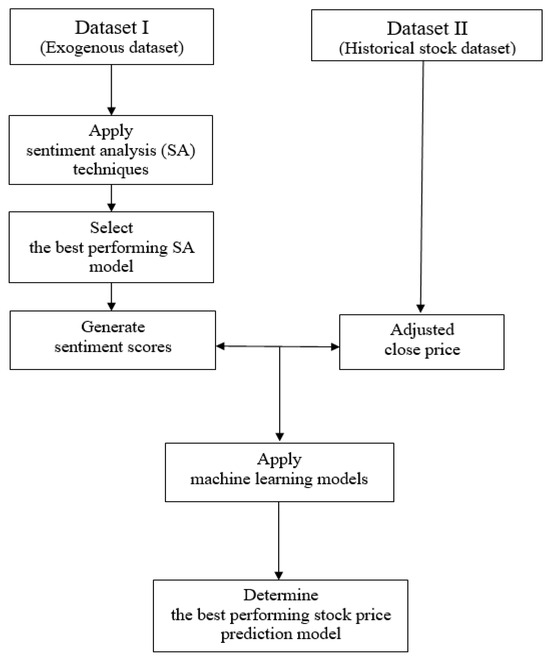 Recent studies have emphasized the importance of incorporating textual data because investor sentiment or external events (for example, Brexit and COVID-19) significantly impact stock price movement [8]. Previous studies [9,10,11] have explored various ML models for stock prediction, incorporating the text data sentiment. However, these models exhibited low performance for predicting stock prices. Further to this, our literature synthesis (presented in Section 2) indicates that only a few methodologies were robust to exogenous variables from sources such as financial news, company news, market sentiment, public opinion, and investor sentiment. In addition, the literature review findings suggest that despite extensive studies on the application of ML algorithms in this context, optimal stock prediction models are limited. For example, [11] used a regression model to predict stock movement based on a sentiment indicator, but did not clarify which stocks were analyzed and no information was provided about exogenous features towards the behavior of the target variable. Additionally, there was no comparison conducted against other models, nor was optimality achieved.