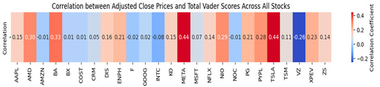 Figure 4 shows the correlation coefficients of various stocks. The results indicated that META and TSLA had the highest correlation coefficients, which were moderate. The order was as follows: TSLA (0.44), META (0.44), BA (0.33), PG (0.21), NIO (0.29), AMD (0.30), AAPL (0.15), and PYPL (0.28). The correlation coefficients showed that, in general, the sentiment indicator provided a moderate to low impact on the price movement. However, it is worth stating that the analysis was based on the sentiment scores of daily tweets. Aggregating scores on a weekly or monthly basis may have yielded a stronger correlation. The volume of tweets (as shown in Table 2) may also have affected the correlation coefficients. We selected the sentiment indicator variable only to assess if the stock price had any impact on public sentiment.
