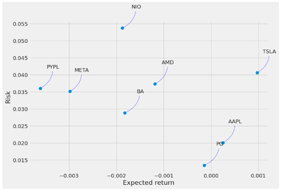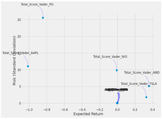 Figure 5 compares the risk and expected return of different stocks without taking sentiment into account. In this scenario, TSLA offered high returns but carried a high risk, indicating significant volatility. On the other hand, stocks like PG and AAPL showed a lower risk and lower expected returns.