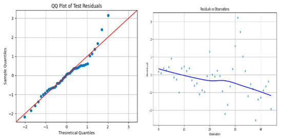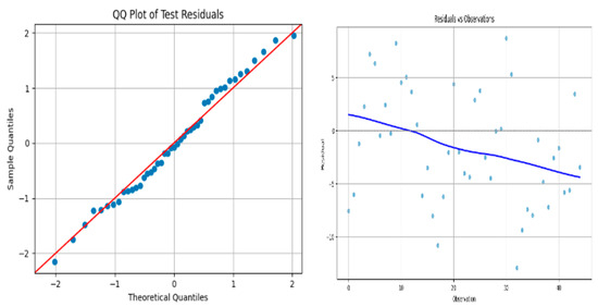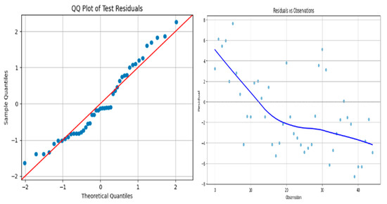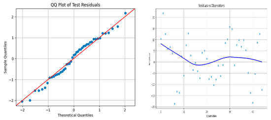 - Q–Q (Quantile–quantile plots): The residuals should follow a normal distribution, and thus the residuals should closely align with the reference line in the Q–Q plot.