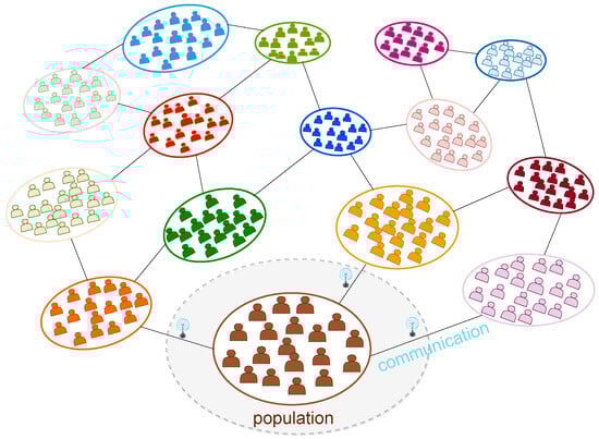 We consider a multi-agent system (MAS) with N agents indexed by , who take part in the game are not all homogeneous, and can be subdivided into P agent populations indexed by , as illustrated in Figure 1. In addition, each continuum population p with small rational agents plays a non-cooperative differential game on a time horizon . To model the set of P distinct and interconnected populations, we assume a graph is given, where is the set of vertices, one per each agent population, and is the set of all weighted edges. More specifically, belongs to E if the corresponding weight . A positive scalar weight means the relative influence that population p assigns to population q. For example, could be calculated as the ratio of the number of agents for population q to the total number of agents for all the neighbor populations. Although most results are easily extended to more general graphs, possibly directed, time-varying, for the sake of simplicity, we henceforward assume that is a connected undirected graph. We denote the set of neighbors of p by , and the cardinality of the set by .