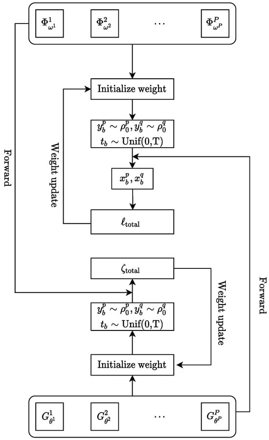 In [48], it has been shown that all MFG systems coincide with an infinite-dimensional two-player general-sum game, and the potential MFGs are the ones that correspond to zero-sum games. In its elaboration, Player 1 represents the whole population and their strategy is the population’s probability distribution. While Player 2 represents the generic agent, their strategy is the value function. The goal of Player 2 is to provide a strategy that yields the best response of a generic agent against the population. This elaboration is consistent with the intuition behind generative adversarial networks (GANs). By drawing from a natural connection between MFGs and GANs, ref. [31] presents APAC-Net, an alternating population and agent control neural network, which is the first model for solving high-dimensional MFGs of a single population in the stochastic case. We extended this methodology to multiple characteristic populations and solved the HJB–FPK coupled system (5)–(9) for a certain population p of the multi-population high-dimensional MFG.