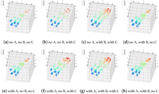 Illustration of multi-group quadcopter trajectory-planning problem. The initial density (bottom left) and target density (top right) are Gaussians at the bottom and top, respectively, of these subplots’ domains. The five groups of agents start from the initial distribution, aiming to move towards the target distribution while avoiding intra-group and inter-group congestion. The colors in each subplot represent time, thus presenting the trajectories of the agents over time. Under different parameter configurations, the trajectories of the agents are different. A stands for noise , B for intra-group congestion coefficient and C for inter-group congestion coefficient . Comparing sub-pictures (a–h), it can be seen that with , the agents add an envelope of uncertainty; with , the agents of intra-group spread out more as expected; with , the clusters are more diffuse.