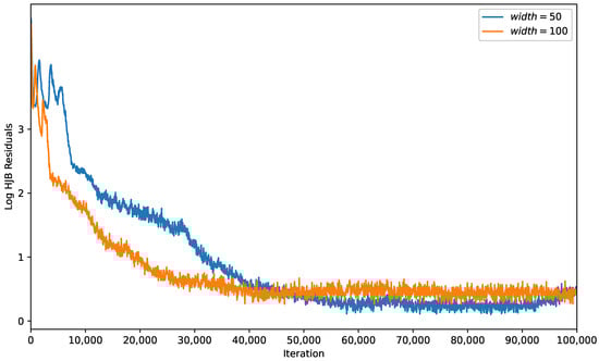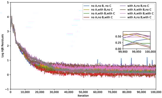 Log HJB residual errors comparison with eight cases in Figure 3. The horizontal axis is the number of iterations, and the vertical axis is in Algorithm 1.