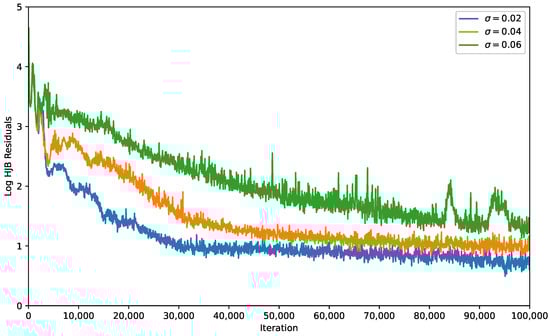 Comparison of log HJB residual errors with stochasticity parameter , and .