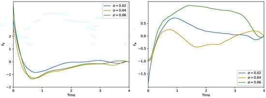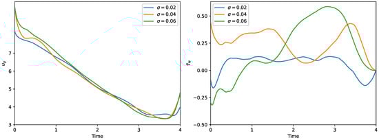 Comparison of controls with different stochasticity parameters. The horizontal axis is time and the vertical axis is (Top Left), (Top Right), (Bottom Left), (Bottom Right), respectively.