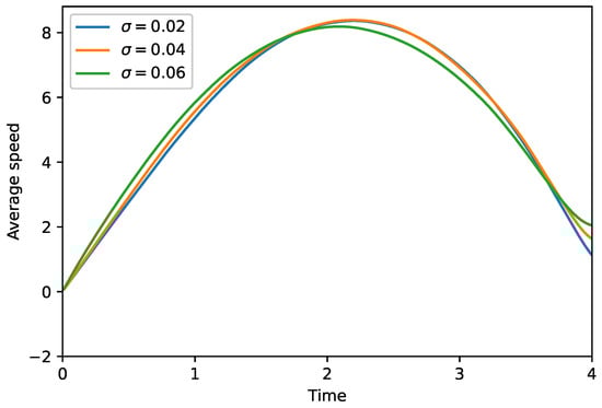 In Figure 7, we show the optimal velocity of quadcopters obtained by Algorithm 1. The initial average speed of drones is zero, and it increases first and then decreases gradually when they approach the target distribution to minimize their loss functions. Moreover, before approaching the peak, when is larger, the quadcopter tends to choose a faster speed. After the strategic speed change, at the terminal time , the smaller is, the closer the quadcopter terminal speed is to zero.