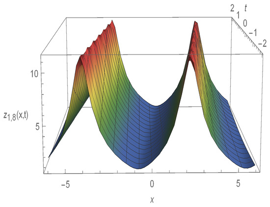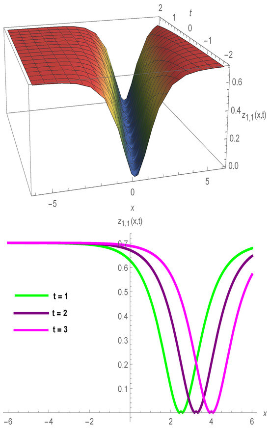 In order to illustrate the travelling wave solutions found in the generalized breaking solution equation and to highlight the characteristics of the various wave solution types, we demonstrate in this section how to use Mathematica to change two and three-dimensional graphs. Figure 1, Figure 2, Figure 3, Figure 4 and Figure 5 illustrate some of the several ways to visualize and comprehend connected physical phenomena.