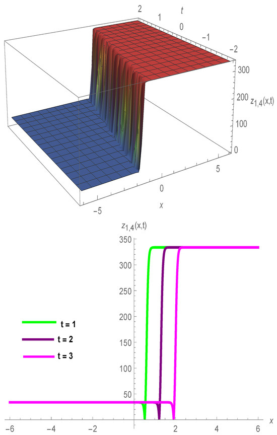 Additionally, we have illustrated the different 2D and 3D graphics behaviors of kink-type wave solutions in for , , , , , , , , and in Figure 3.