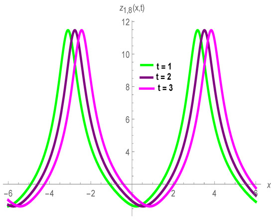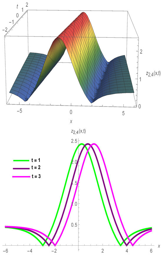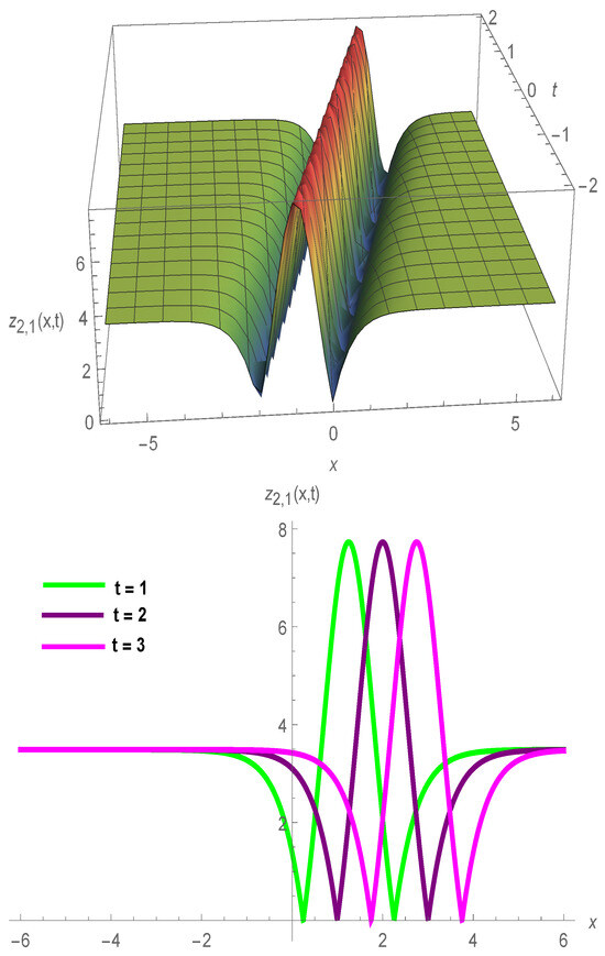 In Figure 4, we have shown how to solve the many 3D and 2D graphical structures of single peak soliton for with , , , , , , , , , , and .