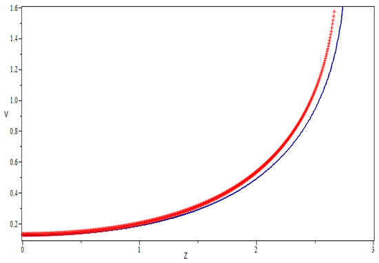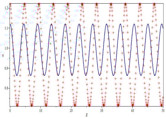 We will keep looking into periodic and quasi-periodic-chaotic behavior through the sensitivity behavior of a significant structural solution at this time (10), which determines two independent initial conditions: in navy blue and in red. The sensitivity behavior of a substantial structural solution at this point (10) indicates the quasi-periodic behavior of the numerical curve and will be used to investigate periodic and quasi-periodic-chaotic behavior further. The initial condition is used to provide two solutions with the same parameter measurement in Figure 9. The colors navy blue and red correspond to and , respectively (see Figure 7a).