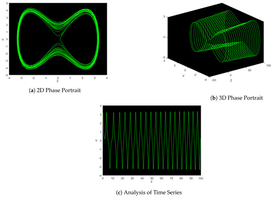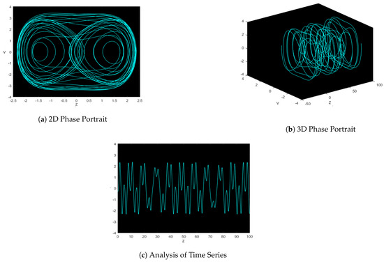 For beginning conditions, 3D and 2D dimensional phase portraits and time series graphs are provided in Figure 11 for , , , , , and , with the initial circumstances . The chaotic behavior of a perturbed dynamical structure (11) has been observed. Time series figures and portraits of the second and third phases are presented in . The disrupted dynamical structures exhibit periodic and quasi-periodic behavior (10). The time-period graph continues to support our hypothesis at these parameter settings.