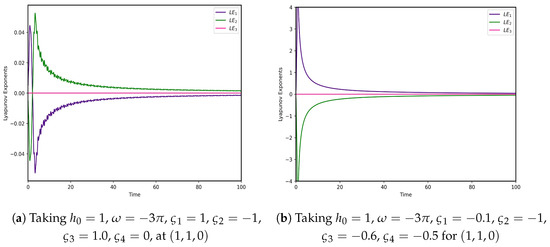 In order to authenticate our claim regarding the chaos of the system, Lyapunov exponent is taken into consideration. The system (11) for , , , , , , and the initial condition as shown in Figure 13a a positive Lyapunov exponent occurs which indicates the presence of chaos in the considered system. Additionally, for system (11) after considering , , , , , , and the initial condition , the positive Lyapunov exponent has been computed as shown in Figure 13b.