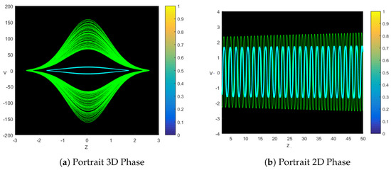 In Figure 14, two types of phase portraits are obtained for , , , , , and , with the first starting conditions and , to illustrate the colors mention green and cyan. The verified system exhibits quasi-periodic behavior with the initial value ; on the other hand, a periodic style with the initial condition and a comparable number of variables is found.
