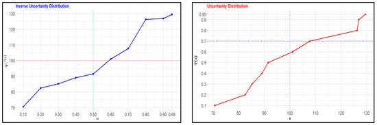 In our example, we used various values for the confidence level α. Primarily, we applied linear and zigzag uncertainty distributions to the links (as shown in Table 1). Constructing these distributions required estimating certain parameters. Some parameters (e.g., a, b, and c in Definitions 3 and 4) of the risk distributions for the links were chosen randomly from a uniform distribution within a user-defined bound. The user also specified the type of uncertainty variable assigned to each link. To apply our computational methods for calculating tolerances, we first need to set a confidence level . Once this is determined, the inverse uncertainty distributions of all are computed (in Table 1), and the inverse distribution of for the confidence level is obtained (in Figure 2). Therefore, a strong relationship must exist between the confidence level and the α-MSTs to ensure the reliability of the results.