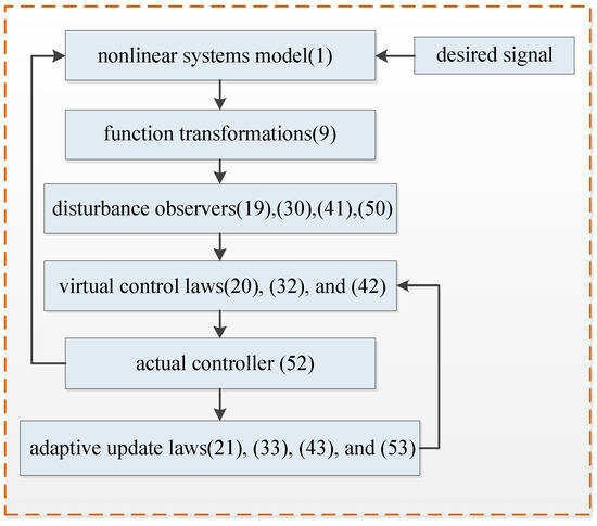 The backstepping method has been a key focus of research in the field of nonlinear systems for many years [1,2,3,4,5,6]. However, its limitations in handling uncertain nonlinear systems have led to the development of hybrid approaches, which combine the backstepping technique with approximate methods, including fuzzy logic systems [7] and neural networks [8,9,10,11,12]. A significant challenge in the conventional backstepping method arises from the “explosion of complexity” phenomenon, which occurs when higher-order derivative operators are applied to virtual controllers. This can lead to increased computational burden and even degrade control system performance if not properly addressed. To mitigate the “explosion of complexity” difficulty inherent in the standard backstepping method, command filters are applied to approximate the differential coefficients of virtual controllers in the course of the design procedure [13,14]. Recent studies, such as [15,16], have reported advances in backstepping command-filtered control for systems with both nonlinearities and uncertainties [17]. However, it is essential to note that these control algorithms overlook the impact of disturbances and model uncertainties.