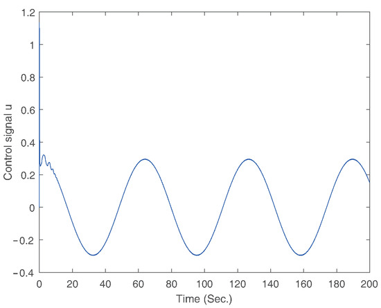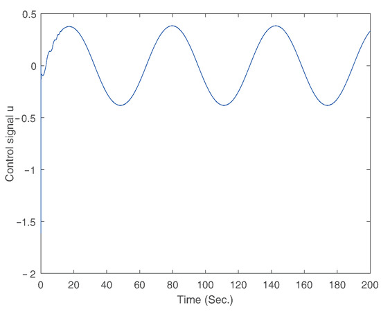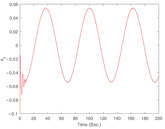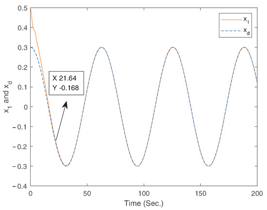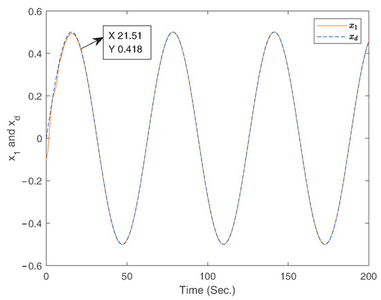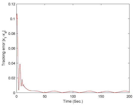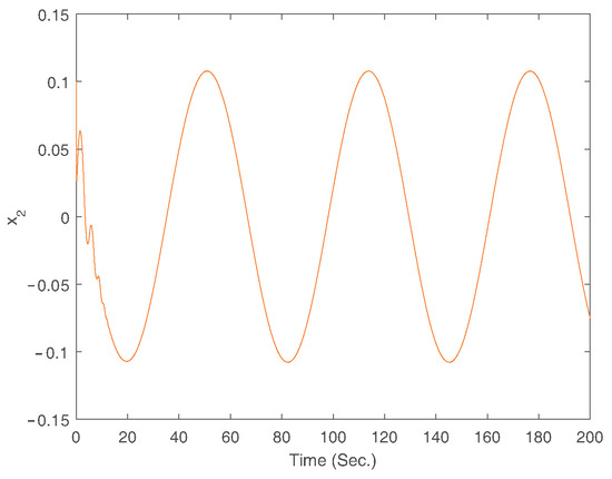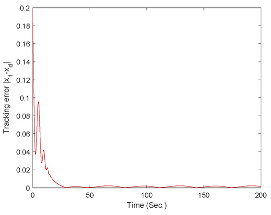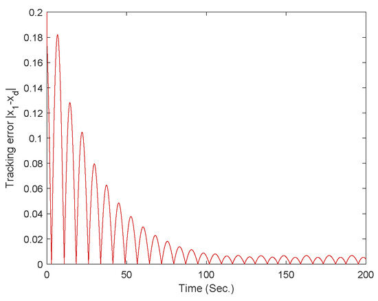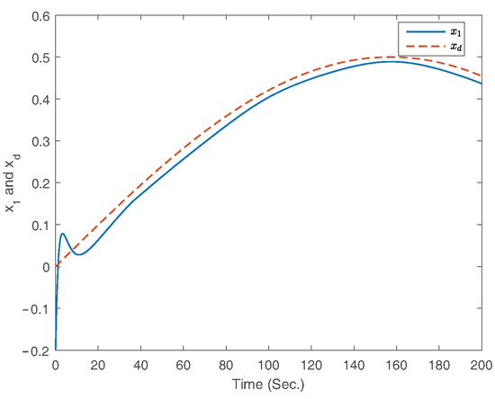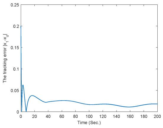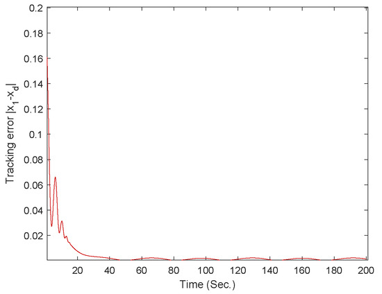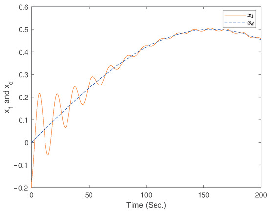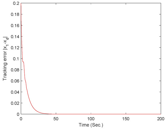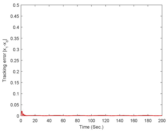 The simulation results for Example 1 are displayed in Figure 2, Figure 3, Figure 4, Figure 5, Figure 6, Figure 7, Figure 8 and Figure 9. Among them, Figure 2, Figure 3, Figure 4 and Figure 5 are for case 1, and Figure 6, Figure 7, Figure 8 and Figure 9 are for case 2. For case 1, the trajectories of states and are shown in Figure 2. Figure 3 gives the trajectory of state . Figure 4 provides the trajectory of the tracking error. Figure 6 gives the trajectories of states and for case 2. Figure 7 displays the trajectory of state . Figure 8 provides the trajectory of the tracking error for case 2. The trajectory of the control signal is presented in Figure 5 and Figure 9 for the two cases. According to simulation results, it can be seen that the fixed-time controller designed in this paper can achieve the tracking control of the desired signal within 25s and the tracking error is less than .