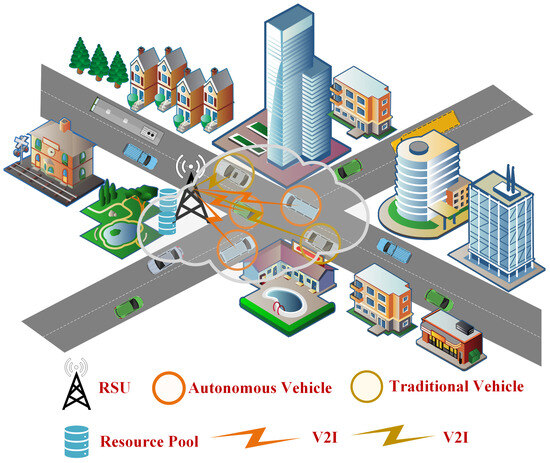 In the designed cloud environment for autonomous vehicles, key components such as RSUs, autonomous vehicles, conventional vehicles, and cloud control centers are primarily involved, as shown in Figure 1. Among these, the cloud control center is deployed on the RSU, which facilitates wireless communication with vehicles through the V2I transmission mode and is equipped with an MEC server to augment computational capabilities. Moreover, we introduce the concepts of resource units and resource pools to better represent the computing resources within the autonomous vehicle cloud. The resource unit is defined as the smallest unit of resources in the autonomous vehicle cloud, and all resource units form a resource pool, which is centrally managed by the cloud control center.