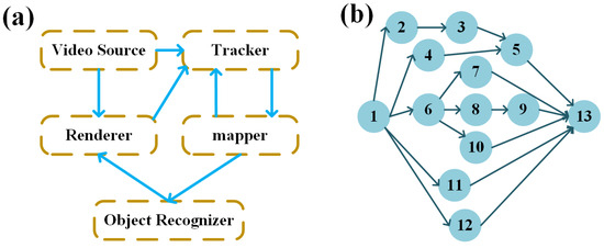 A directed acyclic graph (DAG) is a structure consisting of nodes connected by directed edges, where no cycles are present—meaning it is impossible to start at one node, follow a sequence of directed edges, and return to the same node. This property enables us to model tasks in a way that inherently respects the order of dependencies. Considering the DAG can comprehensively describe a task process sequence, we utilize the DAG to model vehicle tasks with dependencies. In the paper, tasks with dependencies are denoted as , where represents the subtask set, where each subtask is a vertex of the DAG, denotes the set of dependencies, with the dependencies between each subtask forming a DAG edge. Assuming the DAG edge , which includes , representing task , , and dependencies between. In this case, needs to obtain the output data from to proceed, namely, denotes the predecessor task of , and denotes the successor task of . It is noted that a subtask is called the entry or start task if it has no predecessor task. Similarly, a subtask is called the exit or end task if it has no successor task. Figure 2a specifically illustrates a vehicle task with dependencies using an augmented reality (AR) program. The video source and renderer cannot be offloaded, which must be processed locally within the vehicle, whereas the tracker, mapper, and object recognizer can be offloaded. The dependencies between components are visible. For instance, the object recognizer requires the mapper’s output to execute, and this output is subsequently used as input for the renderer. Figure 2b shows the DAG modeling of vehicle-dependent tasks, where task 1 is the predecessor to task 4, and task 5 is the successor to task 4. In the DAG, task 1 is the start task, while task 13 is the end task.