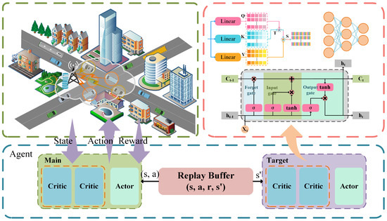 Ning et al. [28] proposed a three-layer offloading framework to reduce energy consumption while meeting the latency requirements for in-vehicle entertainment service applications by leveraging the computing resources of moving and parked vehicles. Faced with the complex resource allocation problem, the issue was decomposed into traffic redirection and task-offloading decisions, which were addressed using the Edmonds–Karp algorithm and a DDQN-based algorithm. Sun et al. [29] studied task migration in vehicular clouds to minimize total system response time and developed DQN-based algorithms. Qi et al. [30] focused on the issue of resource scheduling and offloading under multiple constraints, training across multiple edge nodes using the A3C algorithm to maximize long-term system rewards. Lee et al. [31] addressed service delay issues by utilizing the computing resources of parked vehicles, extracting time and location resource patterns through RNN-based methods, and allocating resources through the PPO algorithm. Recent improvements to traditional single-DRL networks have further enhanced algorithm performance and efficiency. Ref. [32] proposed a task-offloading method based on meta-reinforcement learning, which can quickly adapt to the environment under small samples, reducing system network traffic and service delay. Ref. [33] integrated LSTM with the traditional deep Q-network (DQN) to substantially reduce task loss rates and average latency. In addition, with the development of neural networks (NNs), various network architectures integrated with deep reinforcement learning (DRL) have achieved significant advancements [34,35,36,37].