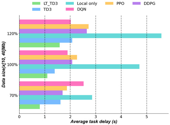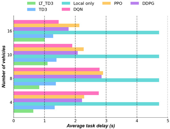 To evaluate the performance of the proposed LT-TD3 algorithm, this paper compares it against foundational models such as TD3, the DDPG algorithm, and local-only processing—namely, no offloading. The experimental metrics include average task delay and task completion rate, which significantly impact the performance and user experience of real-world vehicles. Vehicle tasks with dependencies are generally more complex. A lower average task delay typically indicates better performance and faster task completion, ensuring that the vehicle receives processing results in a timely manner, especially in scenarios that require rapid responses, such as sudden obstacle avoidance and traffic signal recognition. This significantly improves the real-time performance and stability of the system. Similarly, the task completion rate is a crucial metric, measuring the percentage of tasks completed within their deadlines. A higher task completion rate reflects more efficient resource utilization and fewer tasks exceeding their maximum tolerable delay. A high task completion rate enables vehicles to continuously perform various computation-intensive tasks, including path planning, object detection, and driving decisions, thus enhancing the safety and reliability of driving.