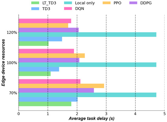 Comparison of the average task delay under different edge device resources in the vehicle cloud.