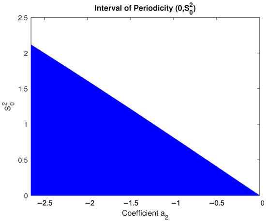 We perform computational analysis on the characteristic Equation (15) over a broad spectrum of coefficient values, . In this process, we ascertain the periodicity interval by assessing the conditions stipulated in Definition 2 for the set , where and . The results of this investigation are illustrated in Figure 1.