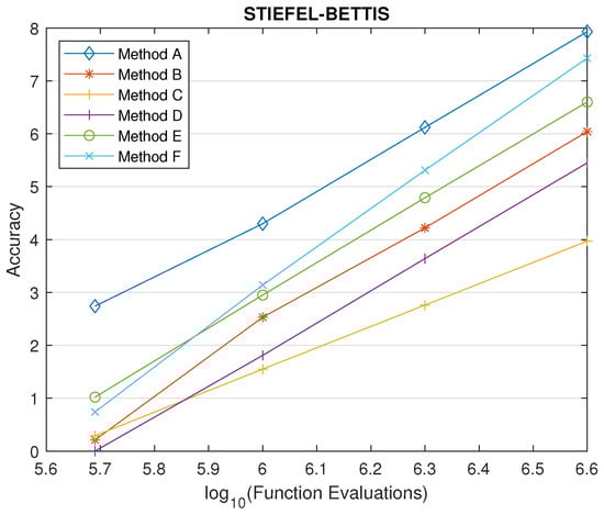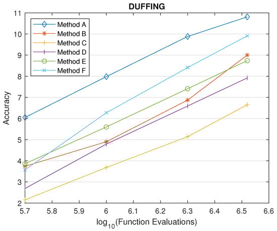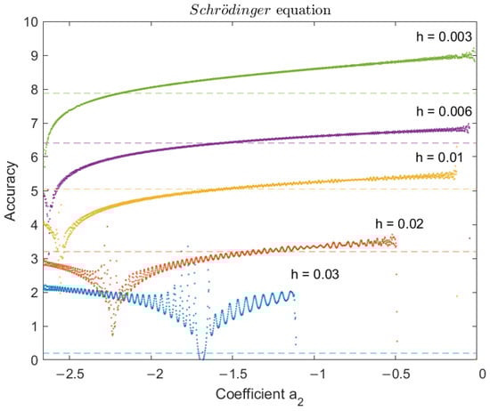 Furthermore, in terms of effectiveness, there exists a substantial range of values for the coefficient , where the new method consistently delivers the highest level of accuracy. These specific intervals commence at the point of intersection between the small dots and the dashed line. For the Schrödinger equation, this interval begins at approximately , for the Duffing equation at , and for the Stiefel–Bettis problem at .
